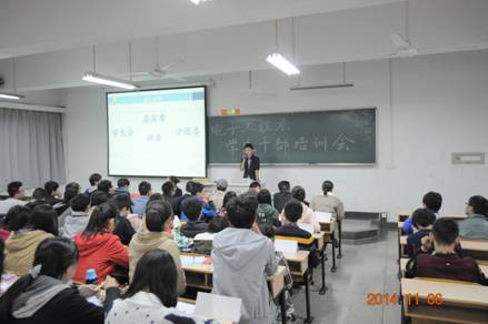 会议首先由主持人开场发言,介绍此次培训会的基本内容,其次便是大一学生代表谈谈对做学生干部的憧憬、大三大四学长从亲身经历简谈学生干部的职能和要求。然后,各位老师着重讲解了如何做好一名优秀的学生干部,对我们提出了很多要求和期望。