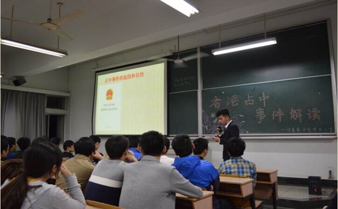 活动期间,主讲人周佳盛阐述了关于香港占中事件的发起者、原因、目的、影响和大学生辨别真假信息的方法。最后在同学的掌声中结束了此次活动,并为本次活动划上了圆满的句号。