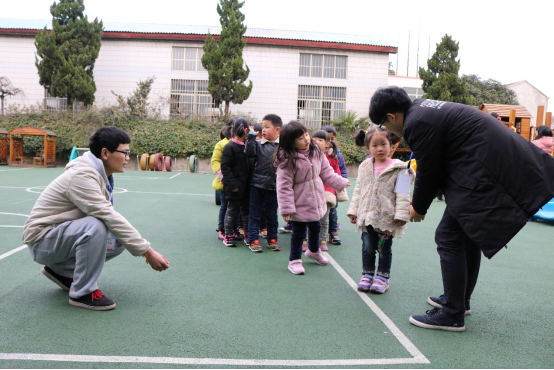 下午,志愿者们到达了幼儿园,十二名志愿者分为四组分别进入中班的教室。当志愿者们进入教室的一刹那,小朋友们用掌声和欢呼声迎接着我们志愿者的到来。随后志愿者带领着小朋友们排队走出教室,走向操场做户外互动游戏。活动在一开始时,志愿者和小朋友们还有一些“尴尬”。但是随着活动的进行,很快他们就熟络了起来,志愿者与小朋友们一起进行着传球、滑滑梯、立定跳远等有趣的游戏,整个沿江中心幼儿园都被他们的欢声笑语所萦绕。