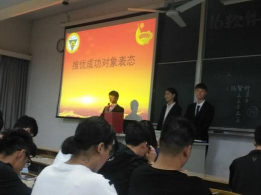 2017年10月10日,16软件1团支部作为示范班级举行了本支部第二次团内推优大会。下午6点,同学们齐聚文昌403,前来观摩此次推优大会的有16级电子与计算机工程学院其他支部的班长和团支书,以及17级班级代表。此次大会我们还有幸邀请到了经济管理学院辅导员苏珍晶老师,以及我院分团委副书记王怀鹏作为此次推优大会的特邀嘉宾。6点半,团内推优大会正式开始。本次团内推优大会共有五项议程:一、奏团歌,二、支部介绍及概况,三、宣读团委文件,四、候选人自我介绍,五、民主评议。