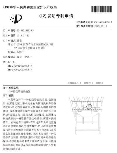 近日,我院电子工程系2011级电子科学与技术专业2班倪淋一同学申请的两项专利获得国家知识产权局的正式授权,成为国家发明专利“一种传送带清洗装置”(专利号201310291038.4)的第二专利权人和国家实用新型专利“一种清洗设备的PLC组合控制电路”(专利号201320253310.5)的第一专利权人。
